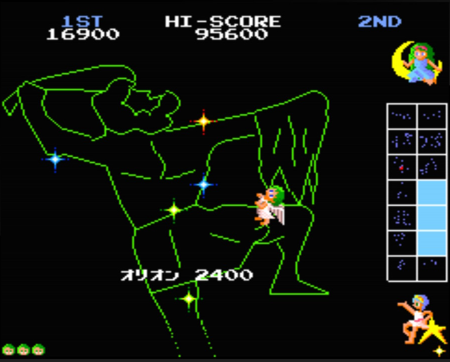 星座を一つ完成させるごとに、その名前とともに星座が表示されるデモシーンが入るため、非常に速いテンポでゲームの区切りに到達します。これほど短時間ごとに節目のあるゲームはかなり珍しい気がします。