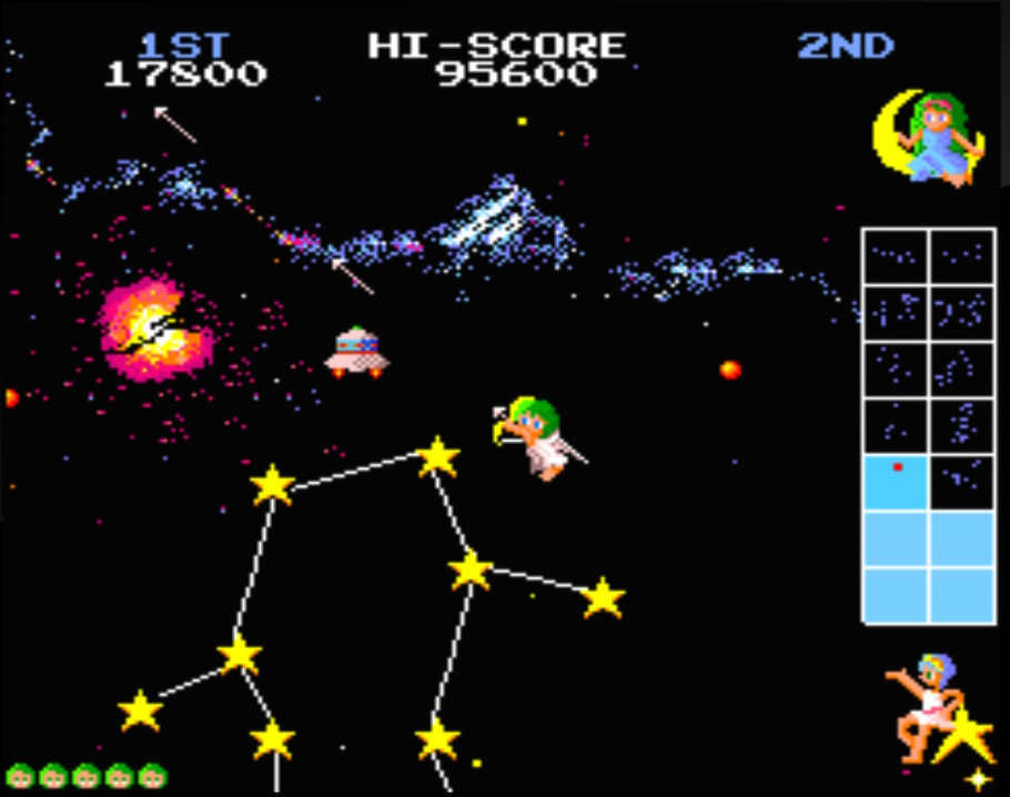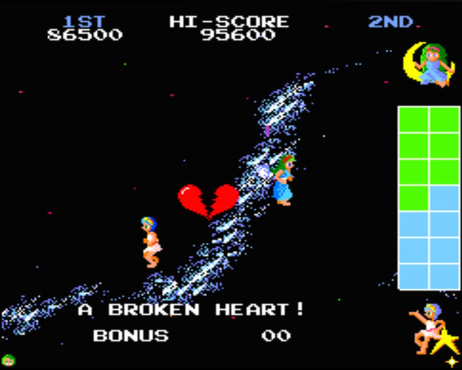 14の星座を完成させると、姫と王子を出会わせるボーナスステージに突入します。姫が反対側から走ってくるので、王子を操作してうまく出会えると成功というゲームです。