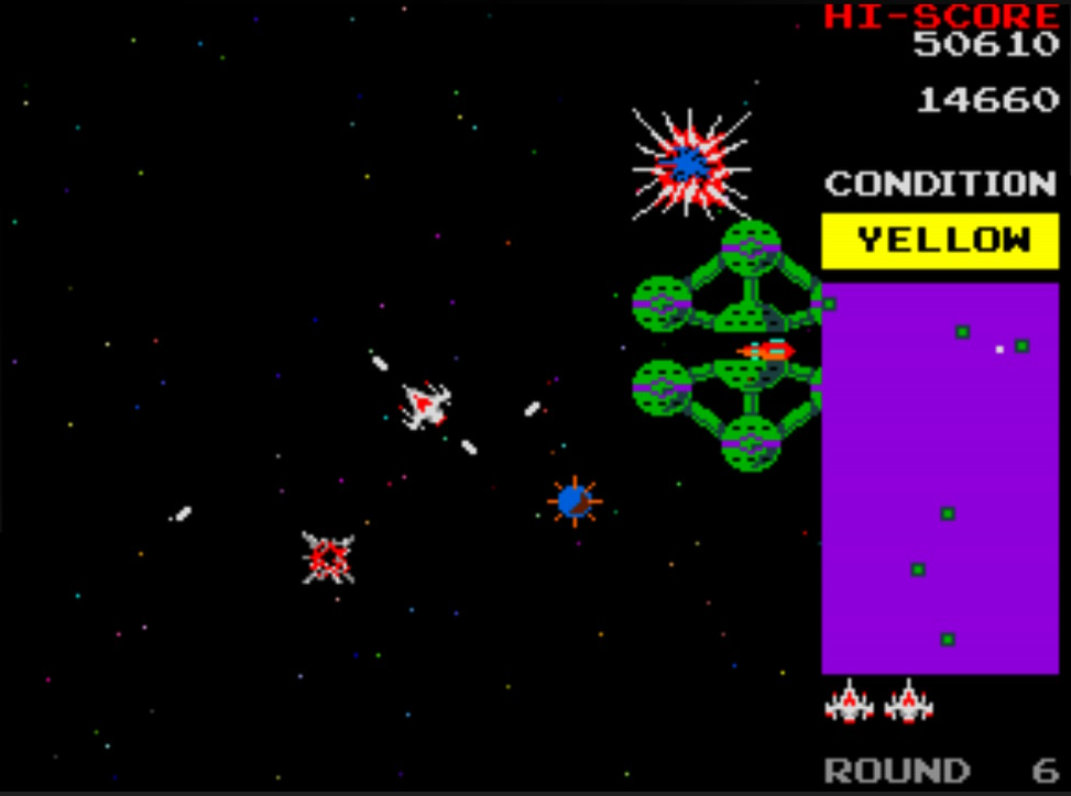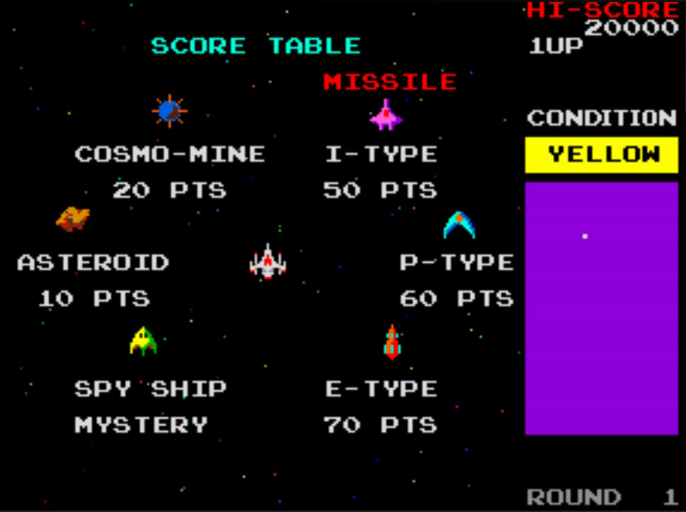 画面レイアウトや、全方向スクロールシステム、レーダーで全体を把握できるシステムなど、遊びとしては別ジャンルながら、同社『ラリーX』『ニューラリーX』の流れをくむゲームといえます。