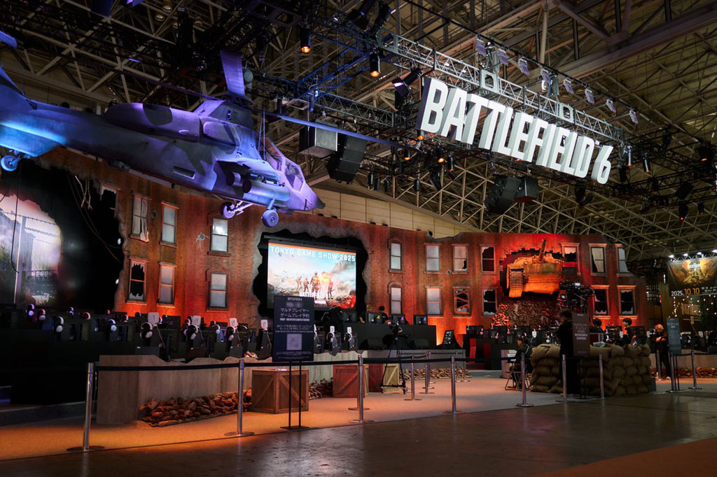 BFシリーズでTGSに出展するのは実に10年ぶりとなった『バトルフィールド6』では、横長のブースに64人が実際に座って64人対戦をするという、過去のTGSでも行っていた“ここでしかできない体験”を今回も豪華に開催。ブースには大きな戦車や上空にヘリもあって、かなりの迫力のブースとなっていました。