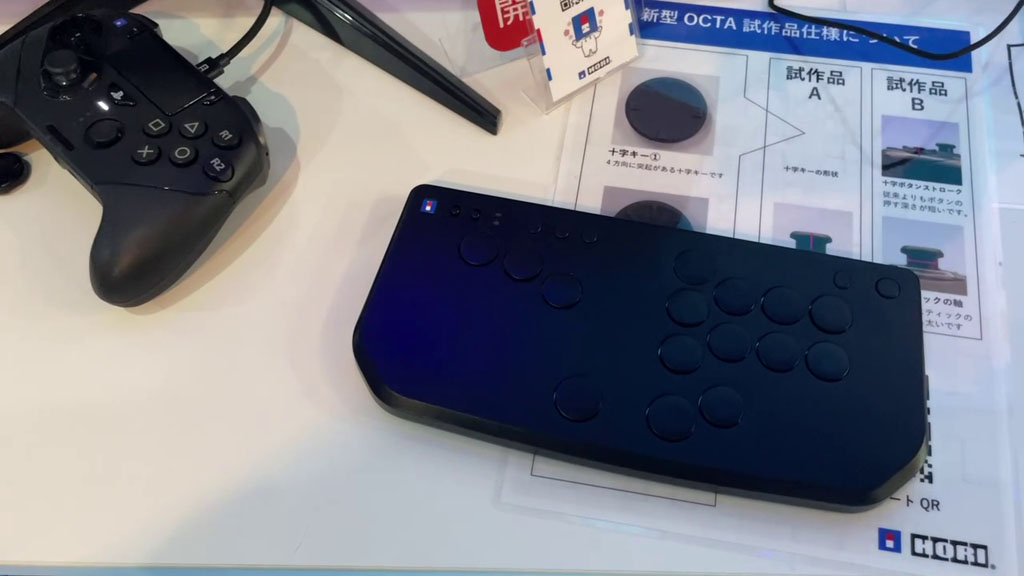 老舗のホリでは新しい非常に小型なレバーレスの試作が展示されていました。長方形でかなり小型軽量。価格は1万円以下を目指したいとのことで、現在同社が販売しているNOLVAよりもさらに廉価なモデルとなりそうです。